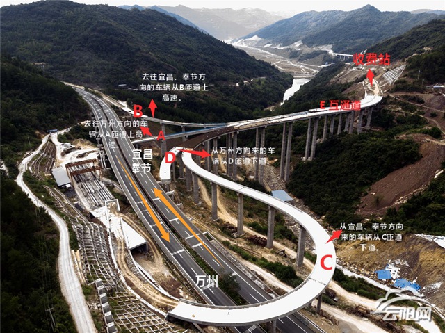 東互通立交工程項目是G42滬蓉高速公路的一條新連接線,全長2441米,主線整體式路基寬度24.5米,新建橋梁5座,總長1117.4米,包括A、B、C、D、E五個匝道和加寬道,車輛可從A匝道上高速通往萬州方向,從B匝道上高速通往奉節、宜昌方向,而奉節、宜昌方向來的車輛可從C匝道下高速,從萬州方向來的車輛從D匝道下高速,E匝道則為互通道,連接高速路口收費站。