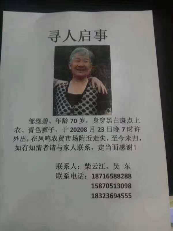 鄒繼碧,年齡70歲,身穿白色斑點上衣、青色褲子,于2020年8月23日晚7時許外出,在鳳鳴農貿市場附近走失,至今未歸,如有知情者請與家人聯系,定當面感謝!