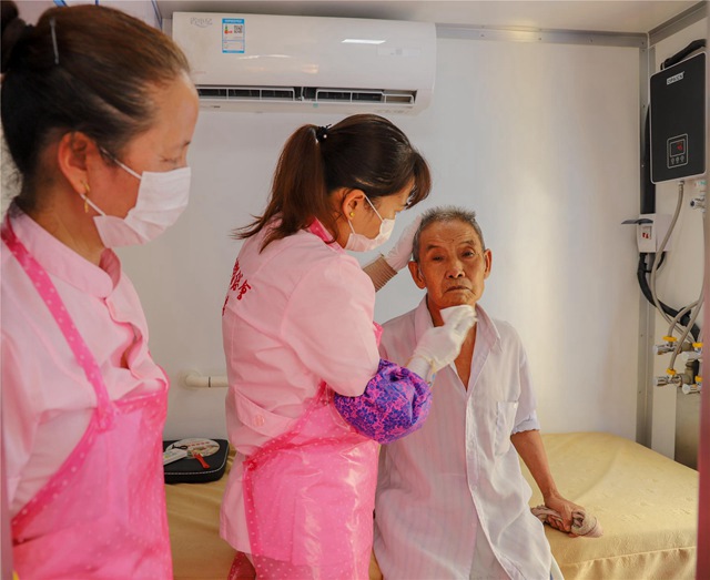 據介紹,助浴快車類似房車造型,車內溫度達到30℃,10余個平方米的空間內配備了專業的洗浴設備、保健按摩設備,分洗浴區、理發區、更衣區等區域。“老人第一次來洗澡,我們會先對其血壓等測量,看是否可以入浴?!敝」ぷ魅藛T告訴記者,在助浴前,會對老人的身體進行專業評估,安排專業人員進行醫療護理,條件符合才準入浴。泥溪鎮敬老院院長黃仁清說:“我們這里的護工比較少,很多老人因其行動不便很不容易洗一次澡。此次助浴快車開進我們敬老院,他們的設備很先進,對老人的服務也很到位,感謝黨和政府為我們帶來了這樣的福利?!?/p>