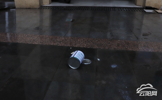 據該小區的目擊者介紹,當天早上7點多鐘,一個鐵罐奶盒突然從小區2號樓高空拋下,只聽“砰”的一聲,砸在小區入戶口路面上。