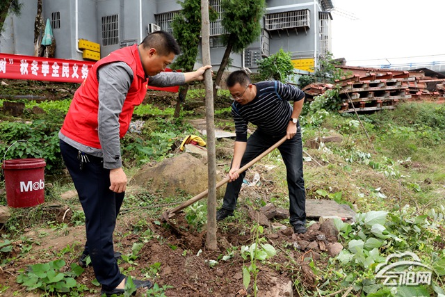 記者在盤(pán)龍街道盤(pán)石社區(qū)濱江蘭庭小區(qū)看到,街道的干部職工、社區(qū)群眾和志愿者分工協(xié)作,有的揮鋤填坑,有的固苗踩土,有的提水灌溉……現(xiàn)場(chǎng)一片熱火朝天景象。