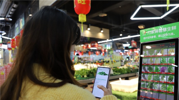 在萬家驛智慧生鮮超市的蔬菜水果銷售區,市民姚女士正在使用溯源智能秤,只見她點擊電子屏上的產品名稱后,屏幕上便顯示了該產品的重量、價格、來源地、質檢報告等信息。