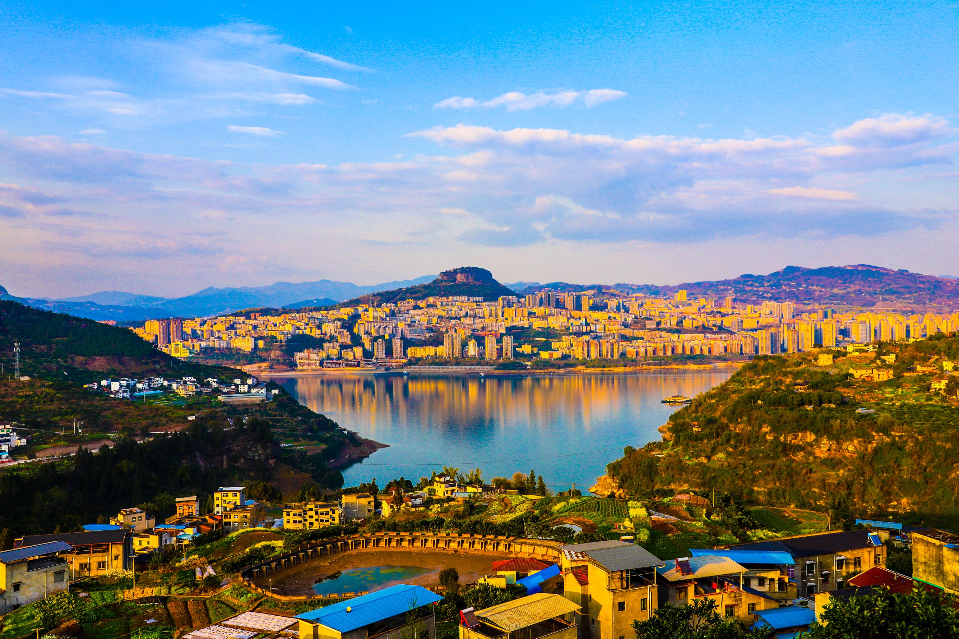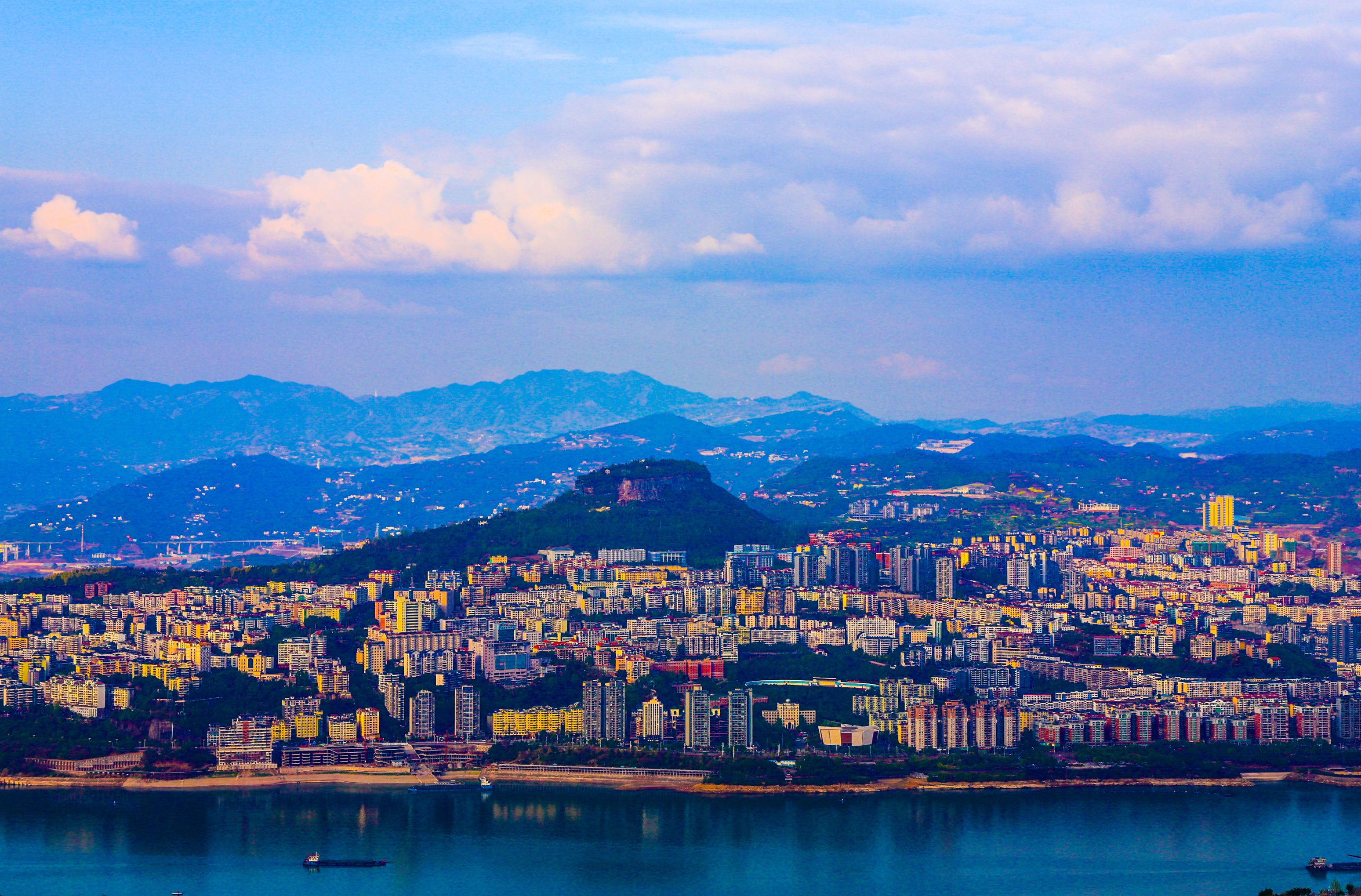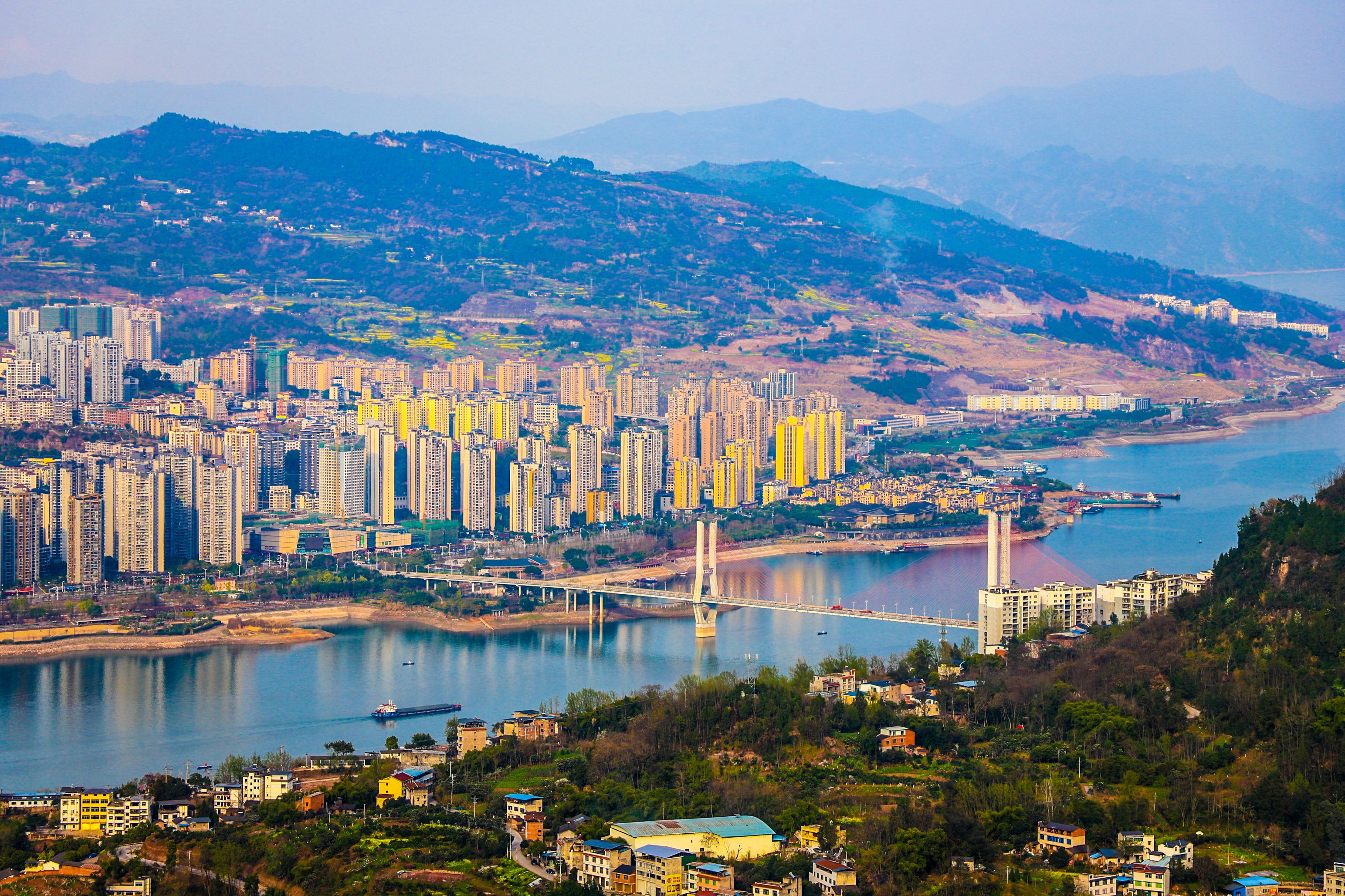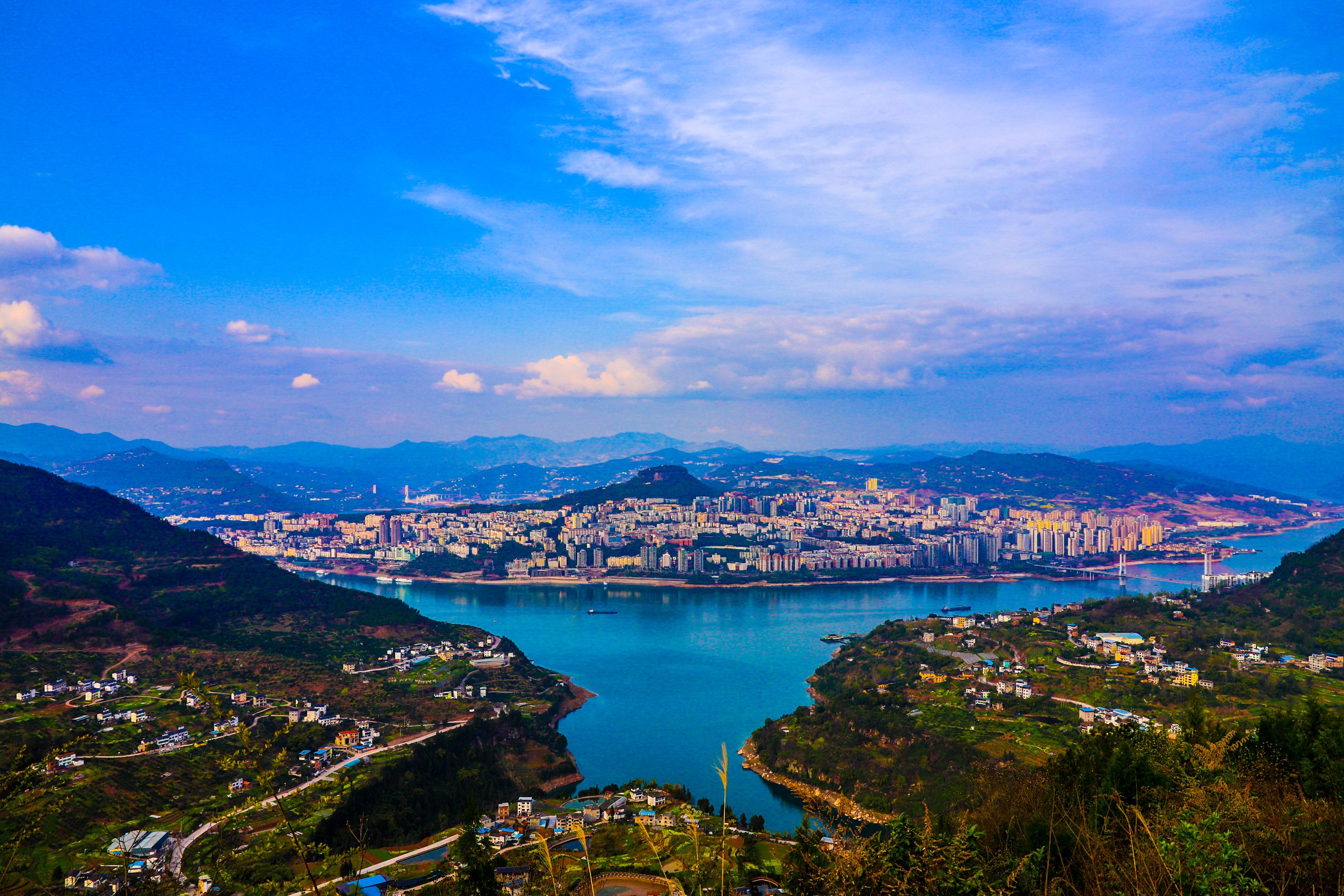 在盤(pán)龍街道陽(yáng)明村觀景臺(tái)俯瞰云陽(yáng)全貌,以磐石城為起點(diǎn),連綿不絕的長(zhǎng)江水向四周蔓延,形成四角,宛如一只飛燕銜新泥。(譚啟云 攝)