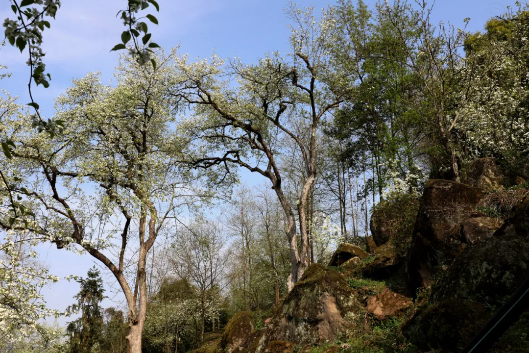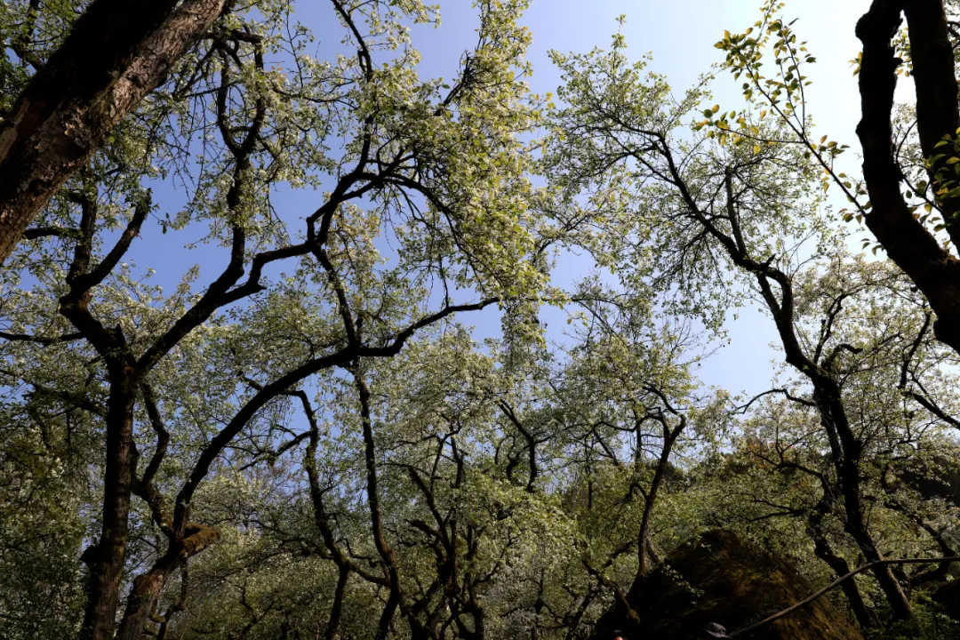 位于磐石城下的古梨園占地面積300多畝,園內300多株古梨樹生長于巨石之中,或樹抱石,或石抱樹,彼此相伴,盤根錯節(jié),盡顯蒼勁之美。據(jù)史料記載,這些古梨樹距今已有200多年歷史,其中樹王200多歲,最小的樹齡也有170來歲。
