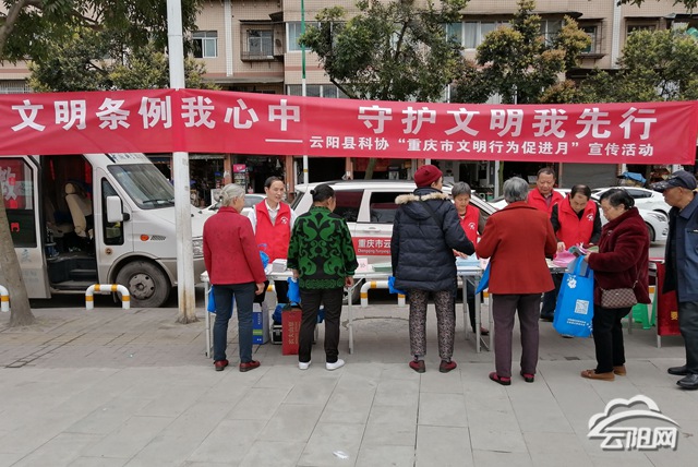 云陽網訊(通訊員 郭蕓)為進一步深化《重慶市文明行為促進條例》的宣傳貫徹,3月17日,縣科協組織科普志愿者在雙江街道黃金包社區開展以“文明條例在心中,守護文明我先行”為主題的重慶市文明行為促進月宣傳活動。
