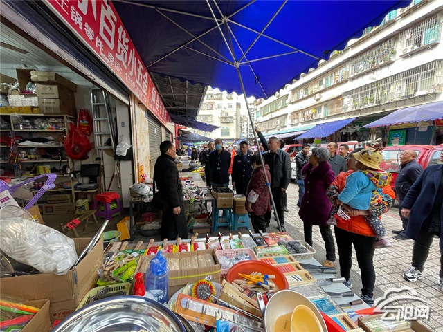 在蓮花市場,執法人員對占道經營、車輛亂停亂放、無證經營、自設遮(陽)雨帽存在消防安全隱患、環境衛生問題等情況進行排查。