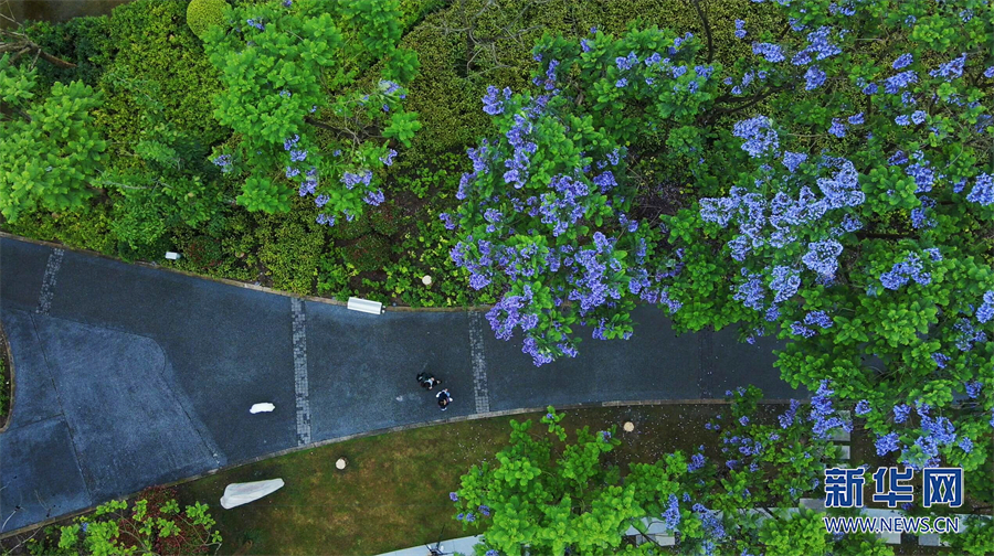樹樹繁花從一大片綠色中透出來,綿延成一條條藍紫色的飄帶,如云似霞,如詩如畫,妝點了都市,也妝點了都市人的生活。新華網發(吳大維 攝)