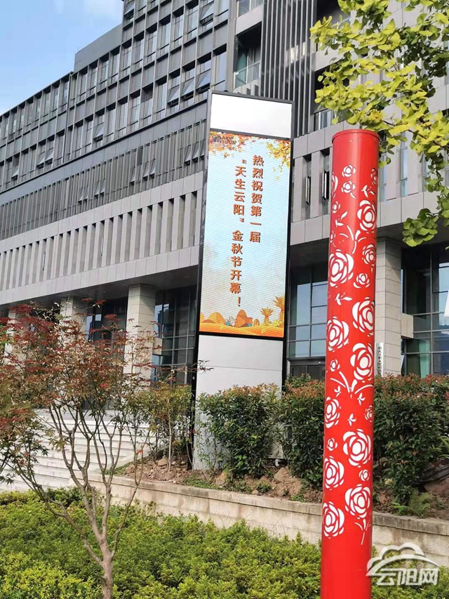 在迎賓大道“水韻”燈柱,也制作了金秋節(jié)的宣傳標語,燈光秀絢爛多姿、流光溢彩。