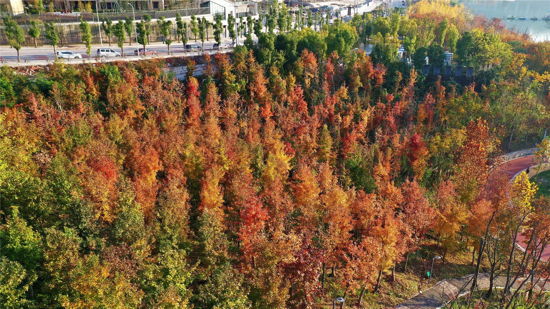 這段時間,隨著天氣放晴,白鷺公園的紅楓樹也迎來了最佳觀賞期。成片的紅楓、水杉等變黃或變紅,色彩斑斕,仿佛調色板被打翻。火紅的楓葉隨著步道、河岸綿延開來,在陽光的映照下,整個公園呈現出一片“紅葉爛漫 層林盡染”的迷人景象。(吳大維 攝)