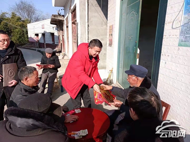 在五保戶劉德友家,看到駐村工作隊為其送來春聯/福字,并主動幫忙粘貼上,他眼含淚花:“感謝政府派來你們,上兩個月送來被子,讓我冬天不再寒冷;現在又送來春聯、福字,讓我過年有了年味!”