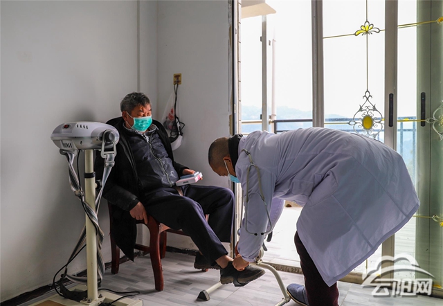 日前,在沙市鎮盛慶養老護理中心的康復訓練室內,今年68歲的王世華在沙市鎮中心衛生院醫務科主任張禮成的指導下,利用康復器材鍛煉身體。此外,衛生院的醫護人員還為養老護理中心的老人們測血壓,查血糖,送醫送藥。