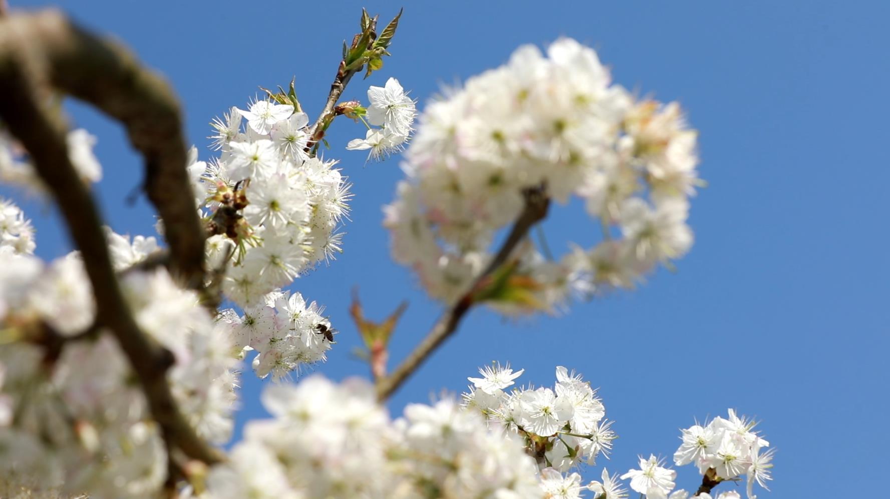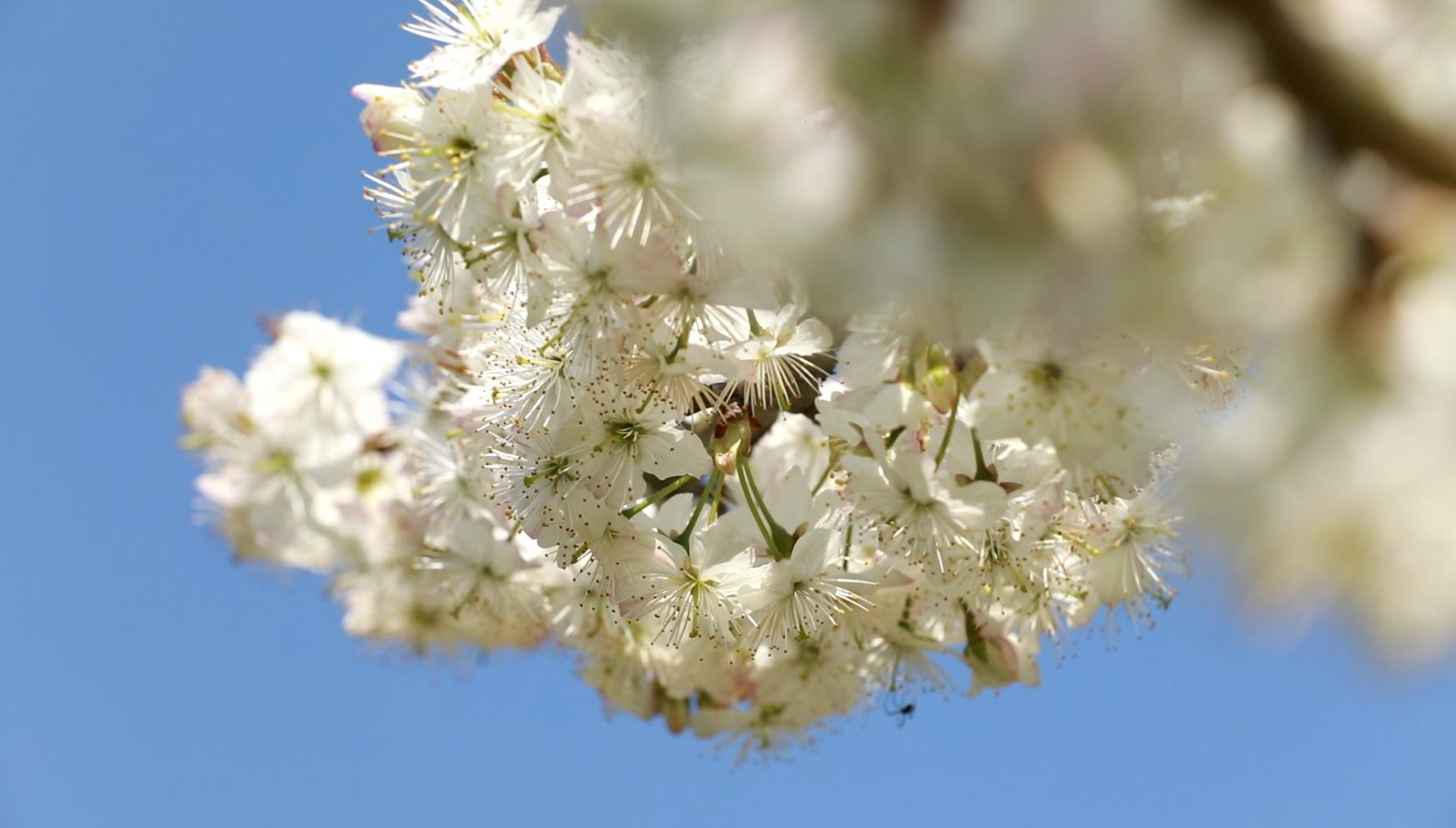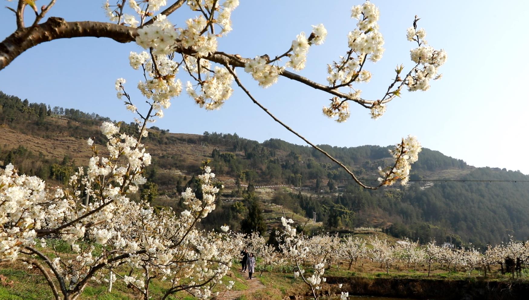 櫻桃千萬枝,照耀如雪天。沿著蜿蜒的山路行至櫻桃園,一片片雪白映入眼簾,花林深處,民房錯落有致,恍入世外桃源。一樹一樹的晶瑩,一枝一枝的花團,擠擠挨挨,密密匝匝,在藍天下盡情盛開。花束間,蜜蜂飛舞,蝴蝶翩躚。春日盛景也吸引了不少慕名而來的游人,大家徜徉在花海間,拍照留影,擁抱春光。