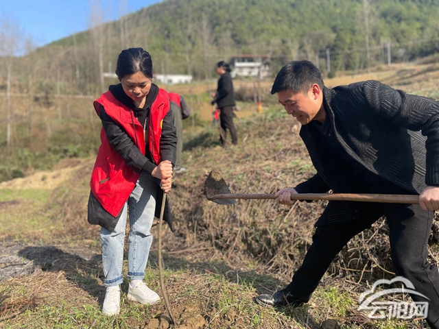 三月的清水,暖陽高照,春風(fēng)宜人。上午八點,植樹活動現(xiàn)場呈現(xiàn)一片繁忙而和諧的景象。參與植樹的機關(guān)同志、志愿者和村民一起揮鋤挖土、扶苗填坑,大家兩人一組或三五成群,各司其職、干勁十足、配合默契,齊心協(xié)力栽下山胡椒樹苗500株,為清水的春天裝點新希望。