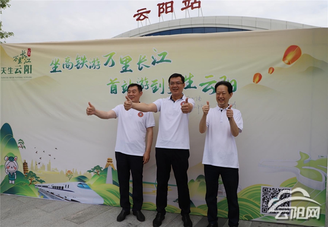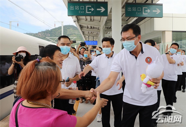 上午10時16分,從重慶西開往巫山的C6418列車準時??吭谠脐栒尽!霸脐枤g迎你們!”覃昌德一行等候在站臺上,熱情迎接到站游客,與大家親切握手,為他們送上“興云兔”,并合影留念。覃昌德說,云陽旅游資源豐富、人文底蘊厚重、生態環境優美、城市宜居宜業宜游,擁有龍缸、張飛廟、三峽梯城、岐山草原、環湖綠道等諸多旅游名片,是度假休閑的美麗之地。希望全國各地的游客朋友們乘坐高鐵來云陽走走看看,欣賞好山好水,品嘗特色美食,感受千年人文。