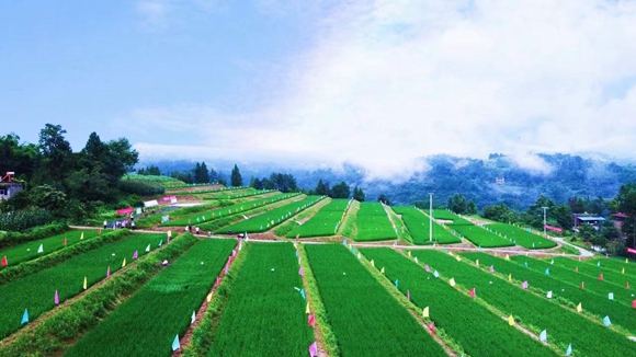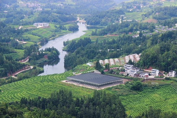 在花千谷玻璃觀景臺上,有山有水有人家的田園風光盡收眼底。層巒疊嶂之間,果蔬、桑田綠意盎然,一條條白色的小道蜿蜒在山間,串聯起每一戶人家,現代農業產業園的建設為鳳鳴鎮帶來了蓬勃生機。