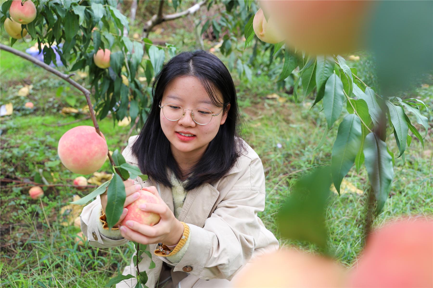 走進桃園,濃濃果香撲鼻而來,讓人垂涎欲滴。低矮粗壯的桃樹上,果實累累。綠葉掩映下,一個個冬桃綴滿枝頭,沉甸甸的果實把樹枝壓彎了腰,游客們一邊漫步說笑,一邊采摘果實,感受著采摘樂趣。“滿山的桃子紅彤彤的一片,長勢看著非常喜人,我們嘗了冬桃,口感很脆很甜。”游客陳怡欣說。