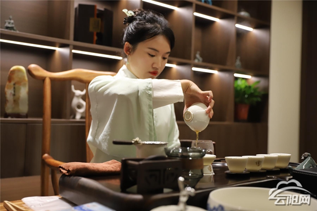 在云曦閣茶業店里,茶藝師們身著不同樣式的華服,手握竹制茶筅,快速地擊拂杯中茶湯,茶湯顏色漸濃,沫浡漸出……頓時,現場茶香四溢。她們的一顰一笑,展示了溫柔婉約、優雅端莊的婀娜形態和古色古香的韻味,將千年華夏服飾風韻演繹得淋漓盡致,營造出清幽雅境的品茶氛圍。云曦閣茶業店長謝萍介紹:“我們將華服和茶文化相結合,給顧客一種新的視覺享受,讓顧客更深入地了解中國的傳統文化。”