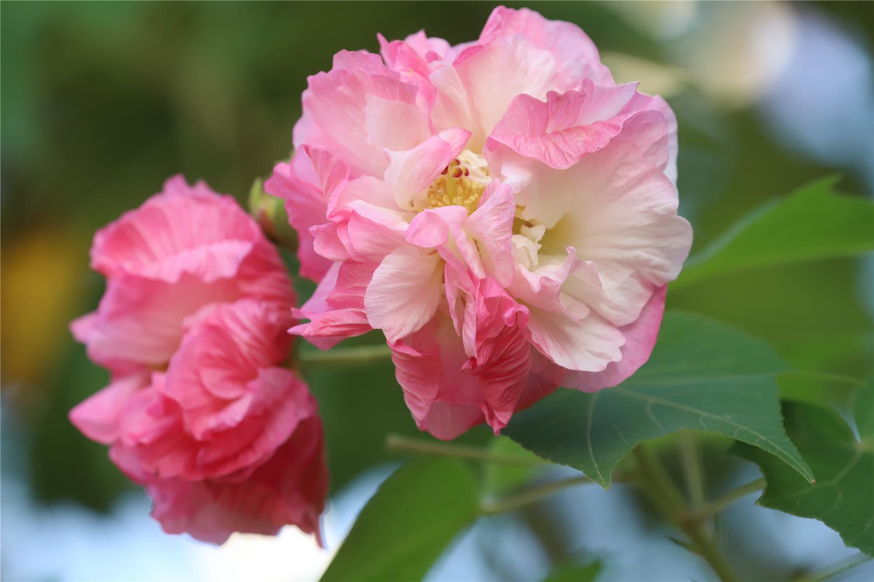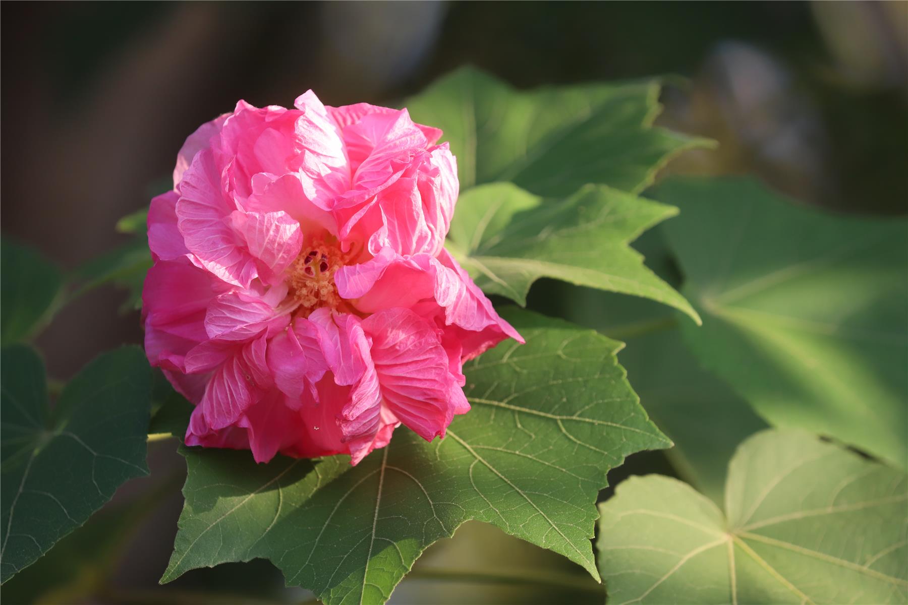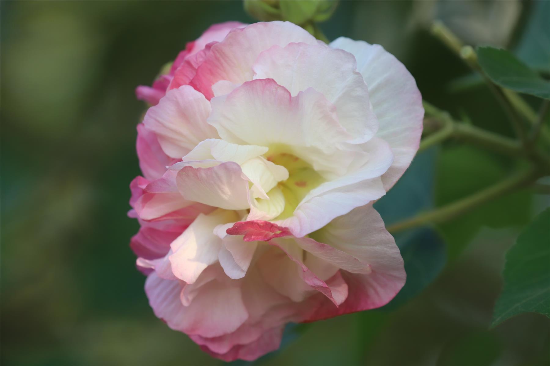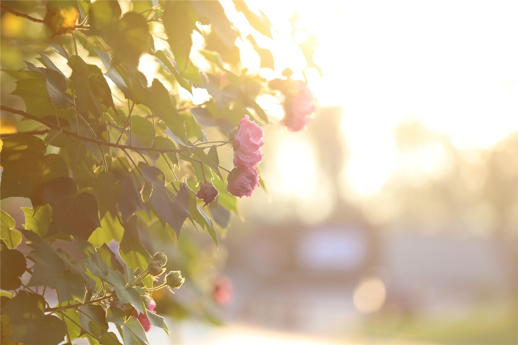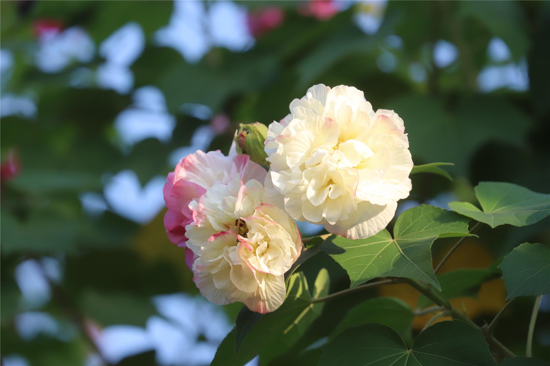 芙蓉花白如雪,粉似霞,紅白相間,宛如雪后之彩霞,花色鮮艷,姿容秀麗,展現(xiàn)深秋的風(fēng)情。微風(fēng)拂動(dòng),紅花綠葉相襯,更顯清新淡雅。在夕陽的映襯下,粉白的花瓣上鋪展著閃閃金光,雍容華貴之姿不輸牡丹,逆光之下,花瓣的脈絡(luò)清晰可見。芙蓉盛開,吸引了不少市民駐足欣賞,他們或贊嘆其美麗,或欣賞其姿態(tài),或贊嘆其芬芳。