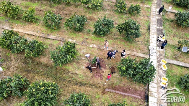 在盤龍街道活龍社區柑橘示范園內,黃澄澄的柑橘掛在枝頭,散發著誘人的香甜。一旁的空地上,一場生動的植樹課程正如火如荼地進行著。