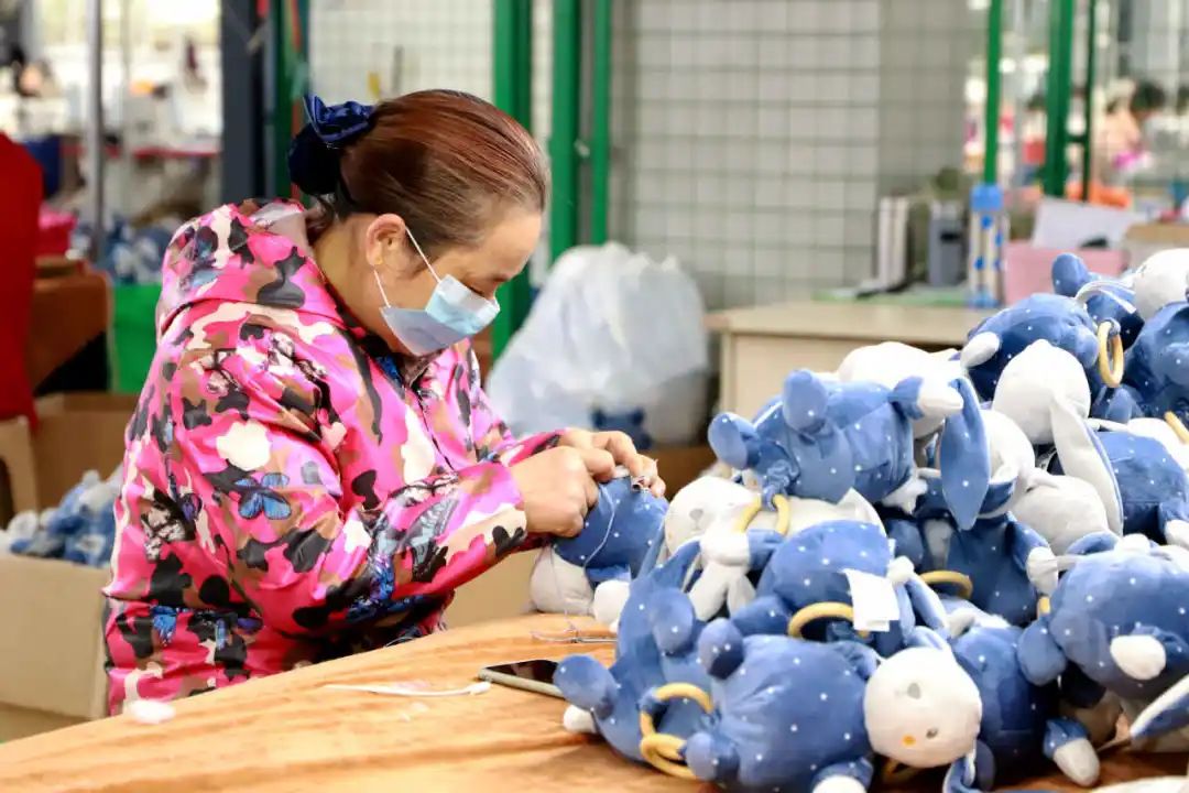 該公司是2020年招商引資來的企業(yè),主要從事毛絨玩具生產(chǎn),于2021年3月正式投產(chǎn),現(xiàn)有員工110人。該公司今年年產(chǎn)值已達1600萬元,為滿足大量的訂單需求,與紅獅鎮(zhèn)的宏懋玩具廠、水口鎮(zhèn)的華盛泰玩具(重慶)有限公司同步加工訂單,為千億工業(yè)生產(chǎn)總值貢獻一份力量。
