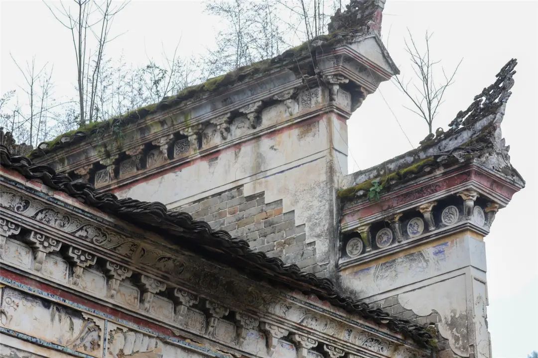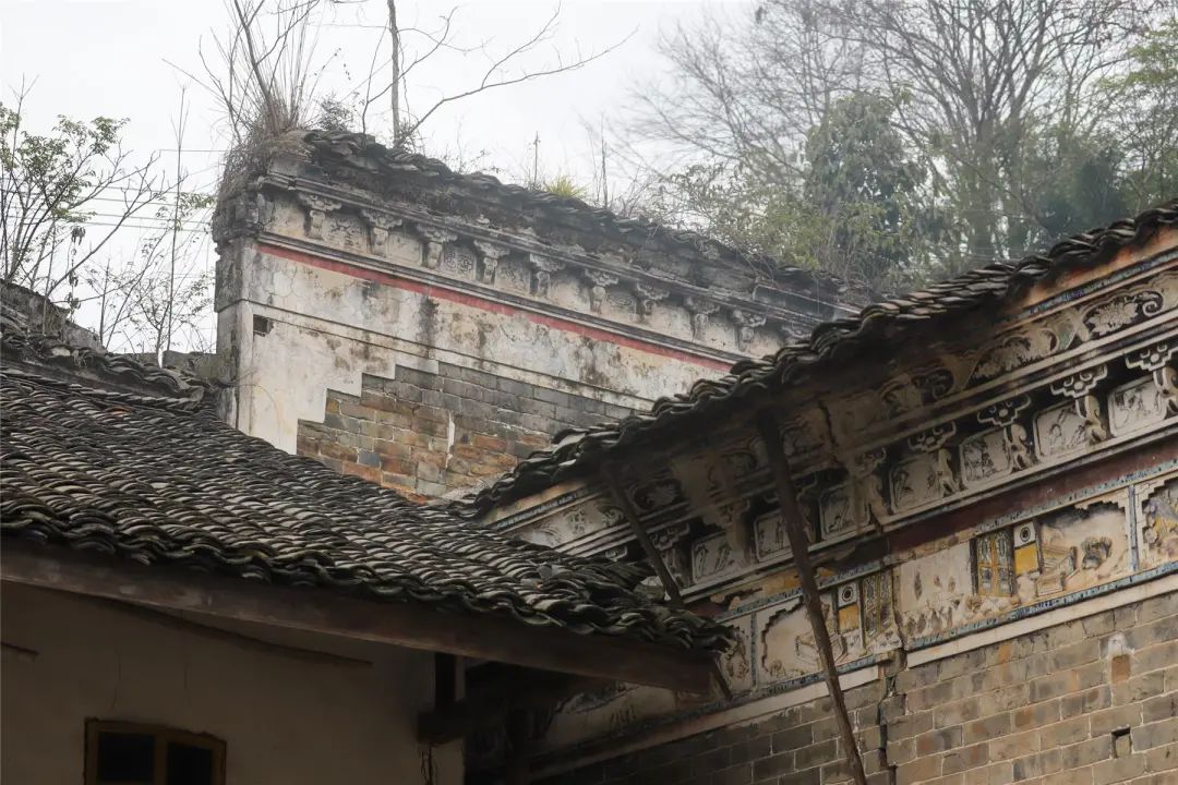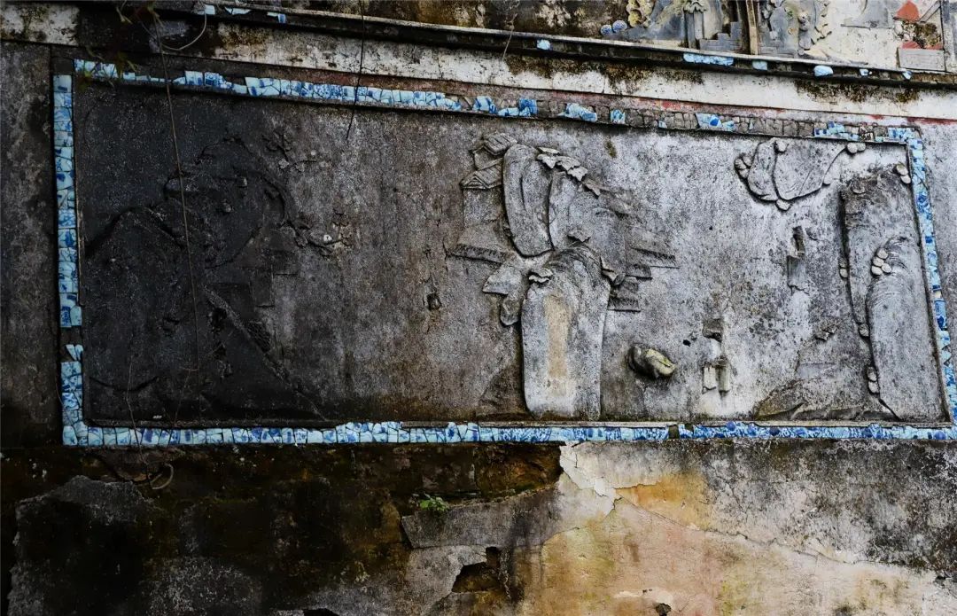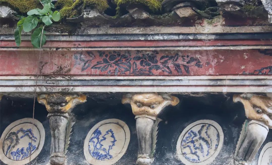 古宅的門樓檐腳,很是講究,用精美的石雕作裝飾。門樓橫坊上,刻有雄獅雕飾,形象生動。門樓石墻的頂端布滿了彩繪、灰塑,部分墻面采用了碎青釉瓷片作裝點。細看門樓頂部的磚雕,串聯著30余幅畫像,有人物、花卉、山水等。