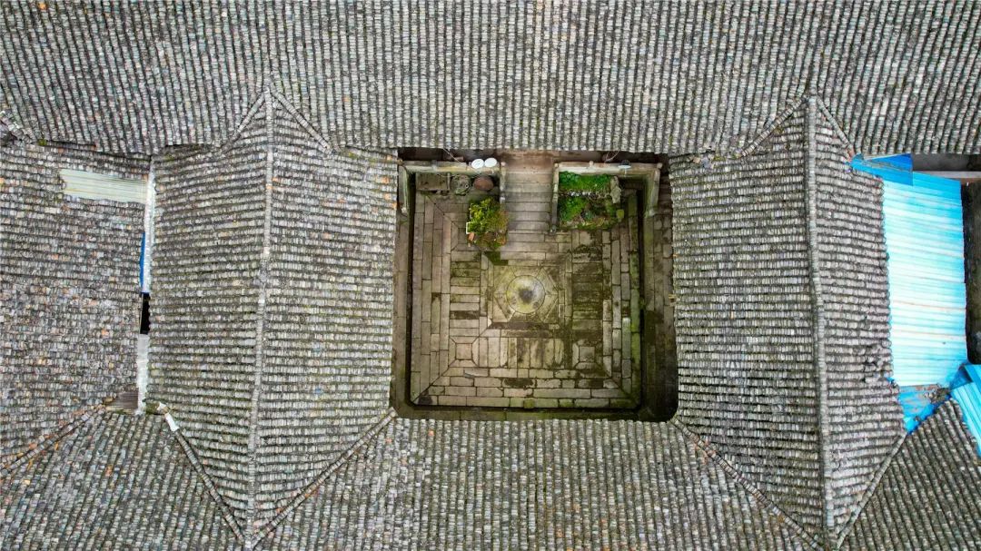 進入古宅,八卦形石板鋪在正中,雕花木扇迎面而設。開敞式天井下,設有四方排水溝渠。可以想象,院內雨水不流向屋外,順勢納入天井之中。