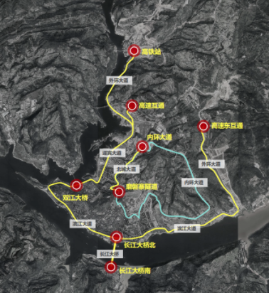 兩路一橋八重門,負山抱水看云陽。未來,迎賓大道范圍更寬廣、內涵更豐富。大道包含高鐵—高速東互通路段、磨磐寨隧道口—內環大道隧道口、長江大橋,沿線聚集了云陽八大代表性的節點,是未來景觀、文化要素的展示地,初步規劃打造成“八重門”。其中,“時代之門”凝聚云陽開拓包容的時代精神,建設具有云陽味的精神地標。“印象之門”將濱江景觀、居住小區和社區公園串聯,展示城市現代生活風貌。“郊野之門”將山景與建筑融為一體,打造近悅遠來的標志性畫卷景觀。“梯城之門”保留崖壁原始生態風貌,將城市階梯、崖壁建筑和社區公園串聯,彰顯梯城拾級而上的生活記憶。“磐石之門”“兩山之門”綜合彰顯云陽開拓建城精神,展示城市發展的時代印記。“云江之門”“追憶之門”與生態的呼應。