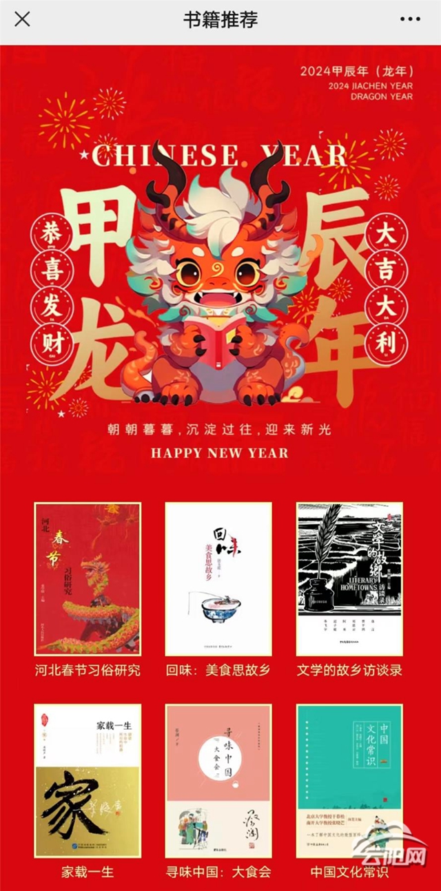 “我們本次活動以‘筑牢中華民族文化之基’為主線,覆蓋成人、少兒、老年、殘障等各類群體,線上線下齊發力。”縣圖書館館長張順介紹,活動期間將陸續開展春節民俗主題展、“龍騰書海,春滿文苑”年俗展、AR百科趣學、新書推薦閱讀、“光影映書香·歡喜迎新年”云圖電影展播、流動圖書車進社區、“迎新春,送祝福”、“迎新春,猜謎語”等8項線下新春活動。