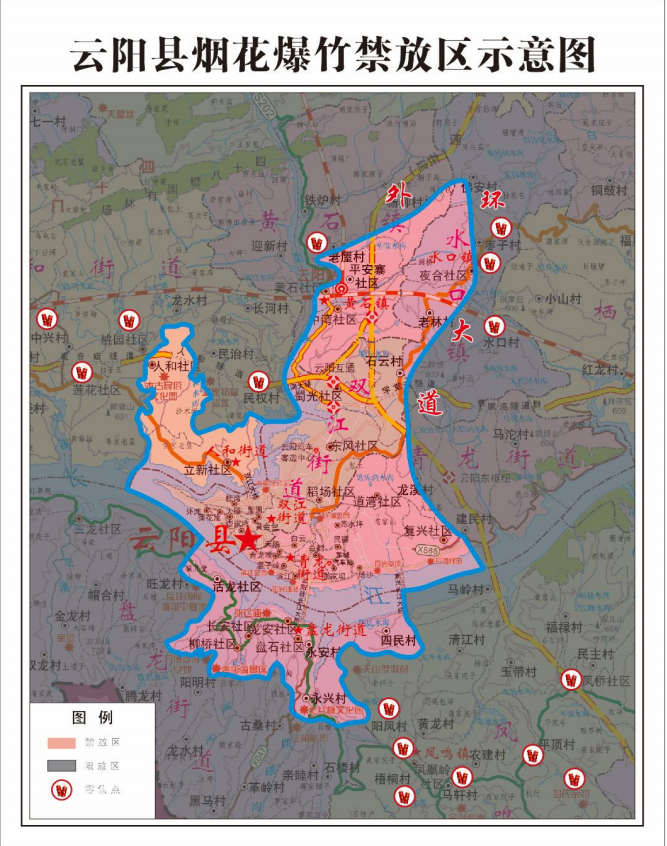 青龍街道禁放區:濱江、白鶴、青龍嘴、磨子嶺、天鵝、張家壩、柏楊灣、白云、民德、亮水坪、楊沙、道灣、復興、錦繡十四個社區;龍溪村、建民村外環大道以內的區域。