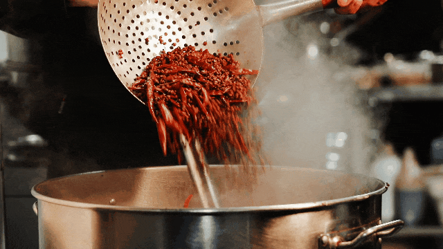 要達到如此令人上頭的效果,離不開這道菜的靈魂——秘制香辣油和香料醬。架一口專用的熬油鍋,依次加入干辣椒、辣椒面、花椒等20多種香料,不停攪拌慢燉,直至香味飄出、顏色和辣度提上來。炒香料醬也是一個細活,將幾種醬料混合,反復翻炒,直至變得黏稠醇香,方可盛起備用。