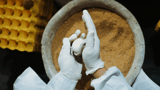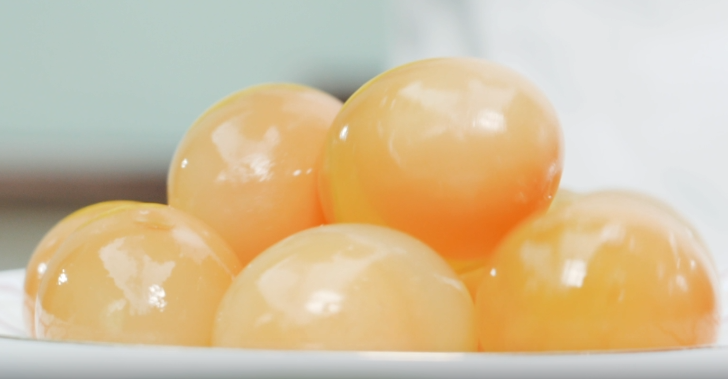 這段時(shí)間,袁廷明正忙著趕制訂單,緊盯生產(chǎn)進(jìn)度。和別家不一樣,袁廷明工廠里生產(chǎn)的皮蛋,保質(zhì)期較短,顏色金黃,無一絲黑色雜質(zhì)。空口品嘗,蛋黃香醇濃厚,堿味淡,口感更好。敲掉外衣,剝開蛋殼,切開后分三圈不同的色彩,外圈金黃透亮結(jié)成晶狀固體,中圈略帶黃色,較軟,里圈呈金黃色,為溶糖狀,稱為“糖心蛋”。