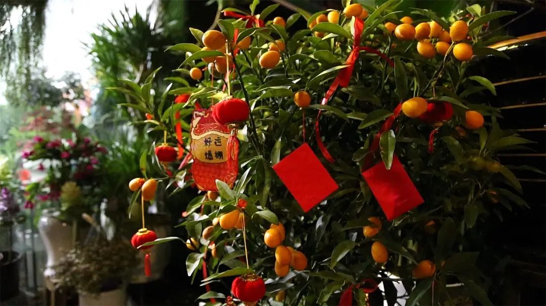為發(fā)財(cái)樹、金桔等意頭好的花卉系上小燈籠