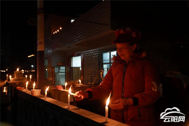 夜幕降臨后,村民們全家齊出動,在門前屋后擺放蠟燭。當一排排蠟燭被依次點亮,整個村子被千萬盞燭火圍繞,猶如燦爛星河。在長灘河畔,千余根蠟燭在夜色中隨風搖曳,用蠟燭點亮的堰坪鎮logo在夜色中格外耀眼。“我們每年都點燈祈福,希望家人身體健康,平平安安。”村民雷恩珍說道。