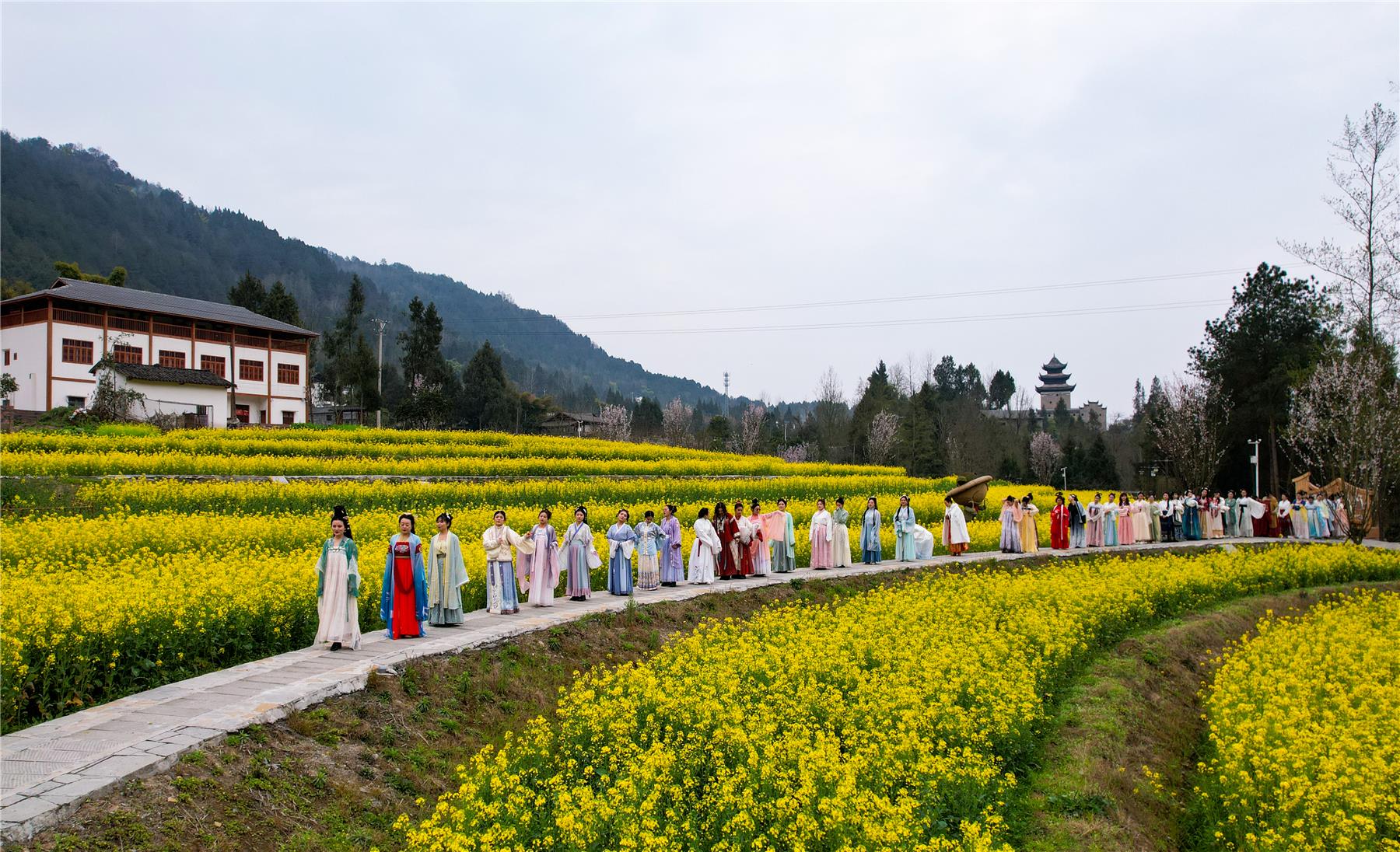 云陽網訊( 記者 譚啟云)春到黎明田園美,風動霓裳清韻舞。3月7日,一場別開生面的花海漢服秀在中國傳統村落云陽縣鳳鳴鎮黎明古村舉行,來自云陽縣教育系統的50多名女教師穿著漢服走進油菜花海上演唯美漢服秀,在踏青賞花之余近距離感受傳統文化。