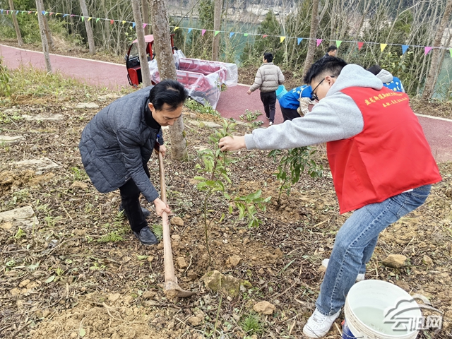 植樹現場,人大盤龍街道工委組織縣人大代表團結協作,三人一小組,鏟土挖泥、扶正樹苗、圍堰踩實,一派熱火朝天的勞動景象。經過大家不懈努力,一株株樹苗迎風挺立、整齊排列,為云陽大地增添一抹新綠。