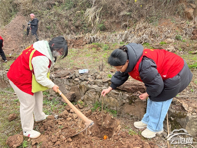 植樹現(xiàn)場,彩旗飄揚,大家熱情高漲、干勁十足,三五個人自由搭組,分工合作,互相配合,有的揮鍬鏟土、有的扶樹填土……經(jīng)過大家的通力協(xié)作,一棵棵新栽種的李子樹苗迎風(fēng)挺立,呈現(xiàn)一片新綠和希望。