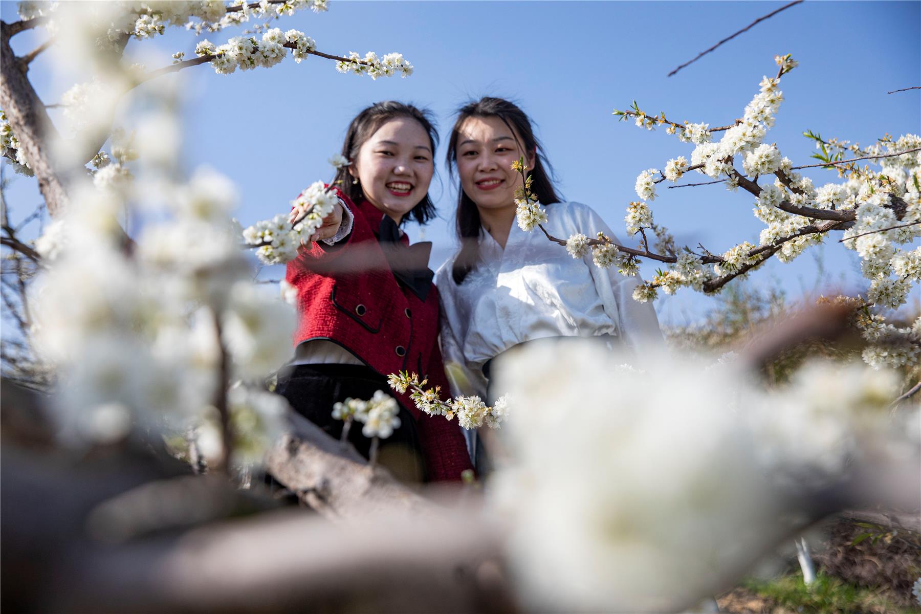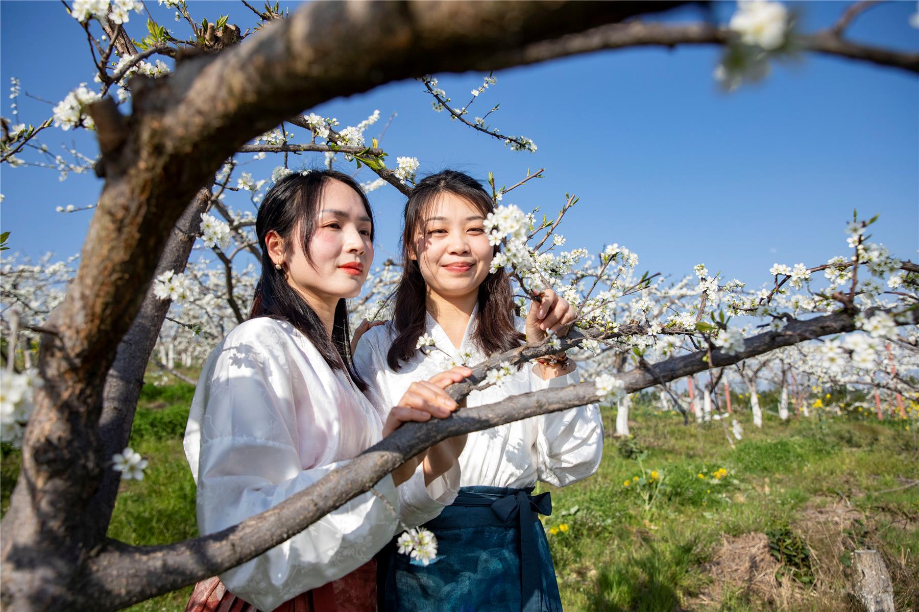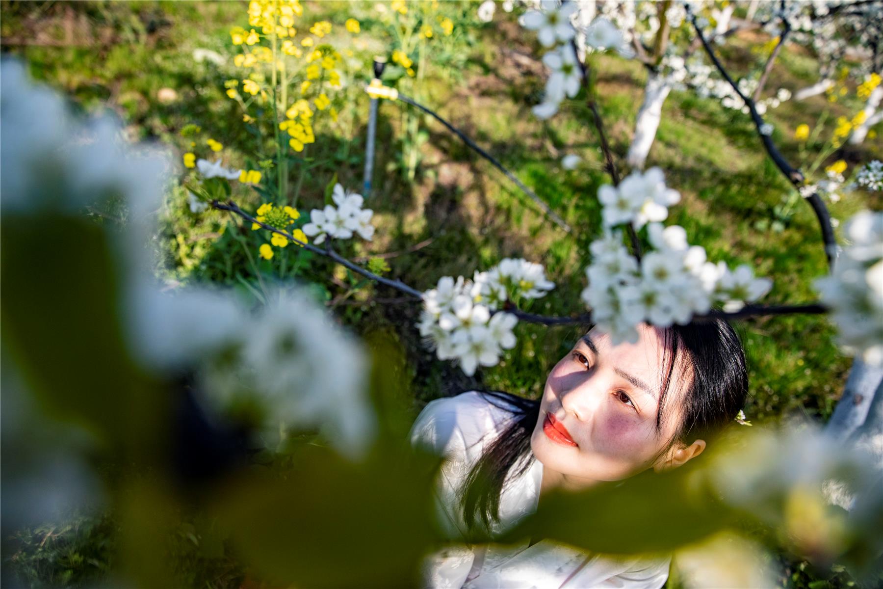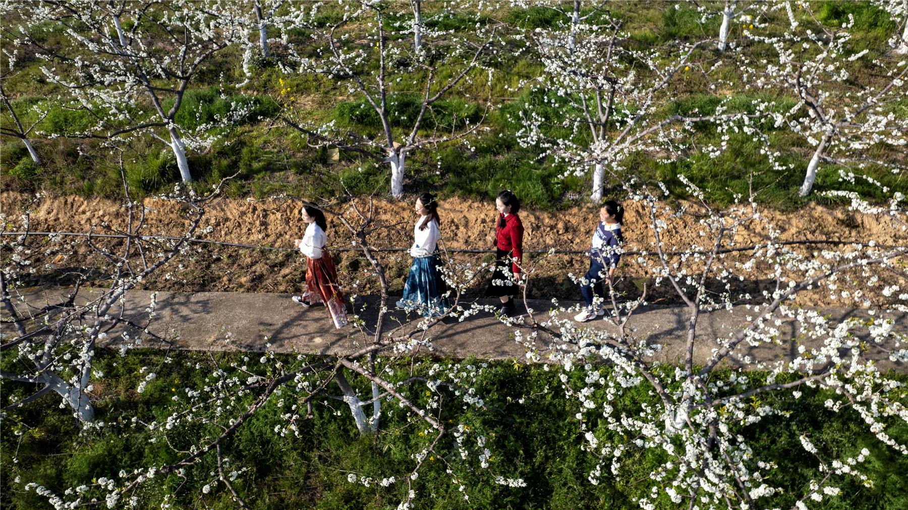游客在李子園奔跑,拍照,擺出各種姿勢,在花枝下定格自己的瞬間。