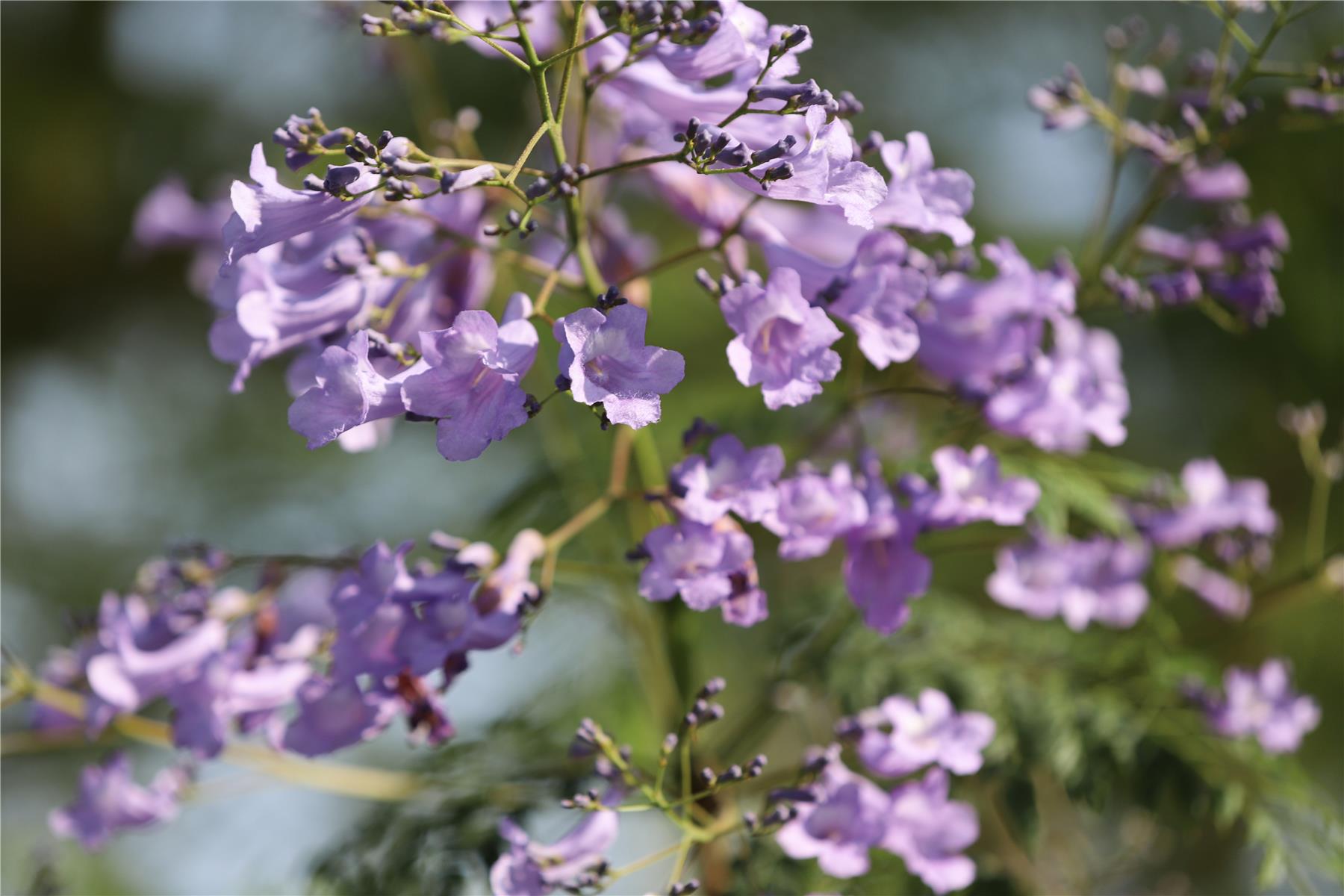 從空中俯瞰,藍花楹花枝茂密,像紫色的花球,和悠悠江水、碧綠的草地構成美麗畫卷。走近藍花楹樹,一簇簇,一團團,一朵朵紫花在藍天白云映襯下純凈而優雅地盛開著。樹上結出的一朵朵小喇叭似的藍紫色花朵掛滿樹枝,團團簇簇、層層疊疊,隨風散落下的花瓣就像是藍紫色的瀑布。微風吹來,花朵輕輕飄落,好像陣陣花雨,讓人心曠神怡。