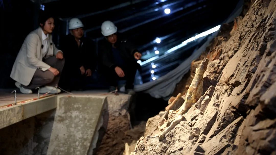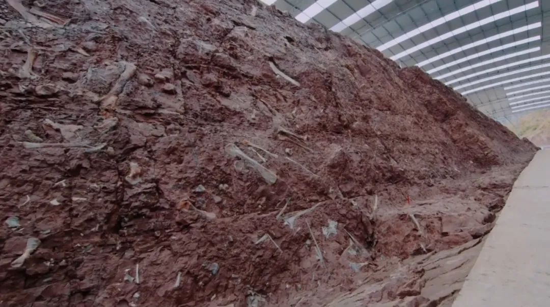 “朐忍渝州龍”化石位于普安恐龍化石墻中部