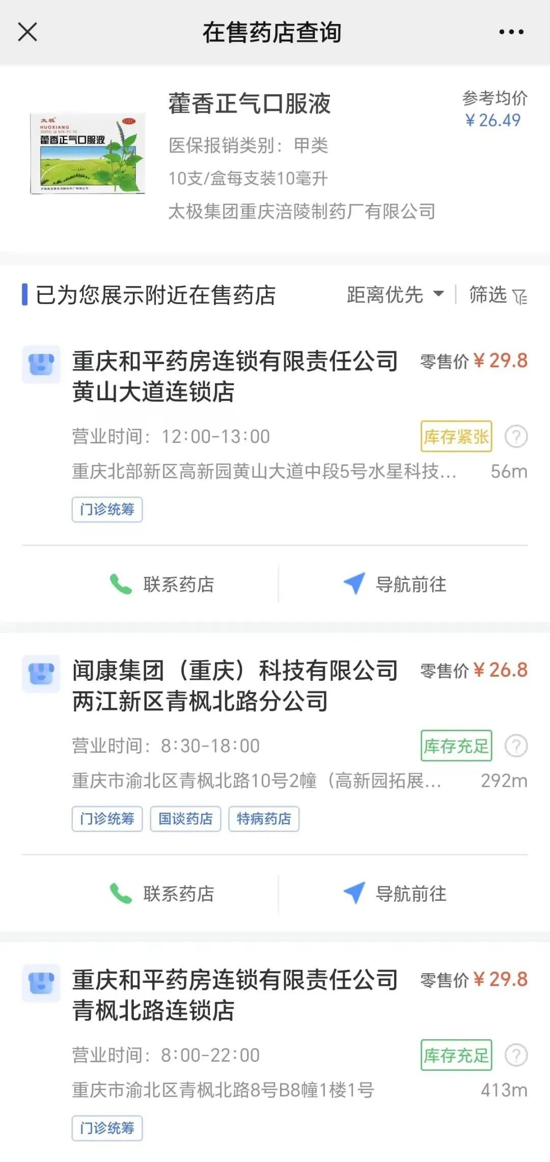 輸入藥品名稱,即可查詢藥品規格信息、庫存狀態、銷售價格及參考均價,全市在售藥店數量、營業時間及地址信息。可按距離或價格優先排序展示,市民可聯系藥店咨詢購藥事宜或按地圖導航到店購藥。