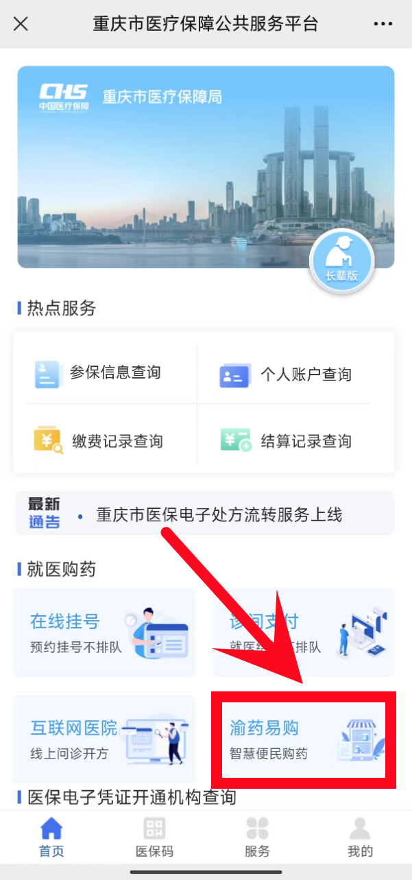 在“就醫購藥”欄目選擇“渝藥易購”服務。