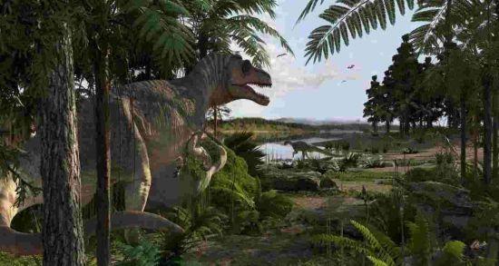 距今2.52~0.66億年中生代自然地貌環境與現代截然不同,天時地利特別適應恐龍生存。地殼劇烈運動在地殼大陸形成諸多山間盆地,河流湖泊星羅棋布,得天獨厚溫床般空間環境為恐龍家族繁衍生息奠定堅實基礎。全球氣候環境溫暖潮濕,極地和赤道溫差較小,水杉、蘇鐵、松柏、銀杏、懸鈴木等喜溫森林植物茂盛,古樹參天,叢林密布,為食素恐龍提供源源不斷的“糧食資源”。專家推測恐龍食物量相當大,一頭30噸重蜥腳類素食恐龍,日進食2噸。中生代煤炭資源廣泛分布,印證彼時高大喬木生長環境。上個世紀80年代加拿大地質學家在北極圈埃爾斯米爾島發現一片以水杉為主樹林以及鱷等化石,說明極地具熱帶氣候環境。