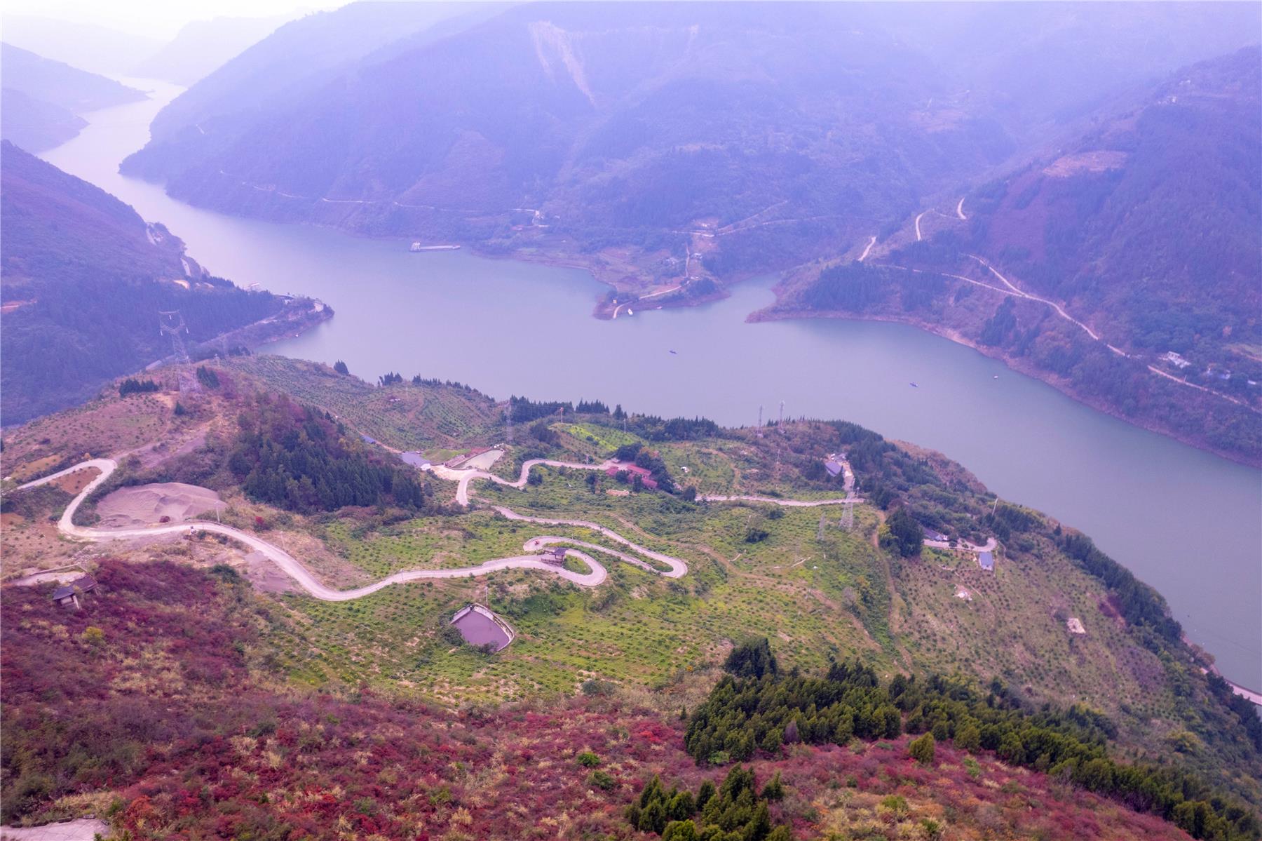 在長江一級(jí)支流澎溪河兩岸,紅葉鑲嵌在兩岸的山坡上,在陽光的照射下,顯得十分艷麗,也構(gòu)成了澎溪河流域一道靚麗的風(fēng)景。