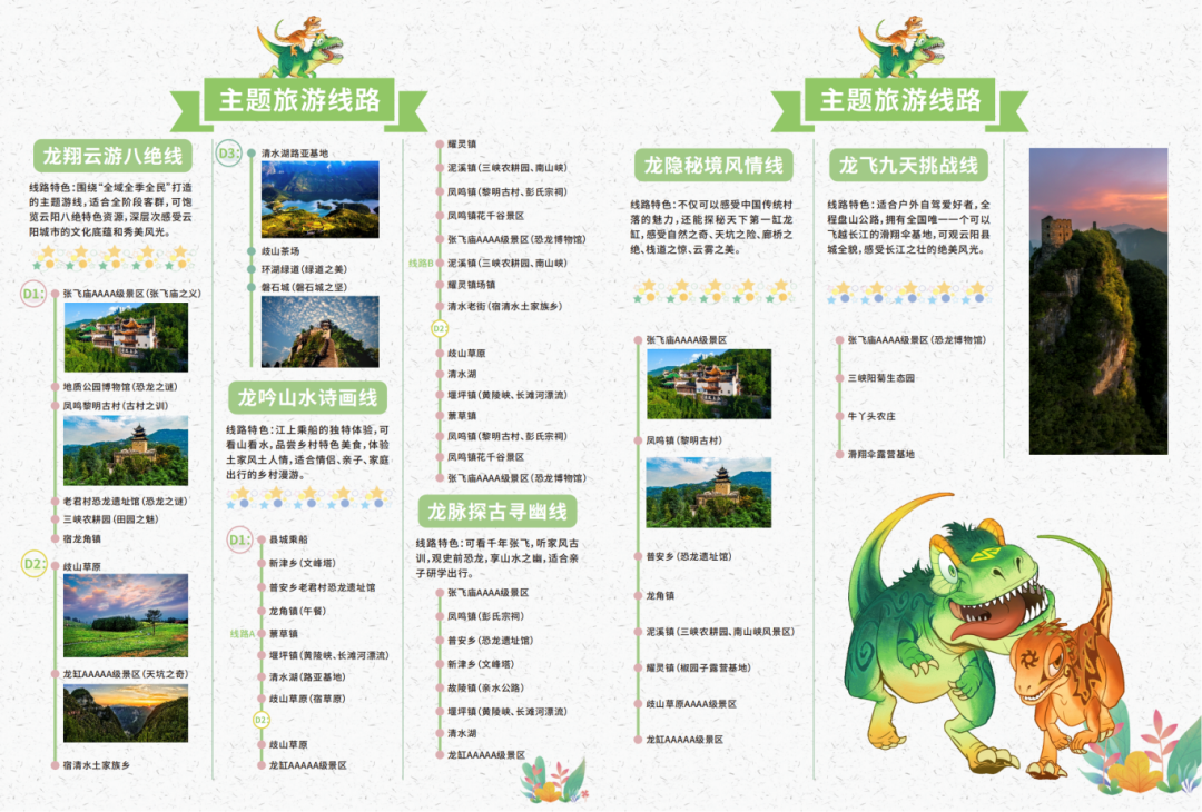 傾力打造龍翔云游八絕線(xiàn)、龍吟山水詩(shī)畫(huà)線(xiàn)、龍脈探古尋幽線(xiàn)、龍隱秘境風(fēng)情線(xiàn)、龍飛九天挑戰(zhàn)線(xiàn)5條主題旅游線(xiàn)路。還有超多本地美食、體驗(yàn)項(xiàng)目及住宿推薦,讓游客朋友們玩得開(kāi)心、吃的安心、住的舒心!
