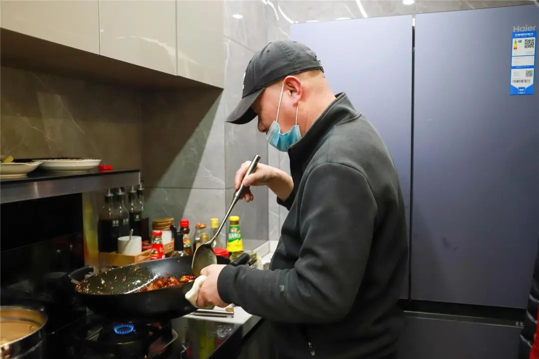 下午兩點,王文祥準時到達了全女士家中,在她的引導下徑直走進廚房,將口罩調整戴嚴實后,再次將手洗干凈,迅速找到調料、洗菜盆、鍋具炊具等的位置,樂呵呵地說:“你啥都不用管了,接下來就交給我吧。”看了一下昨天記錄的菜單,王文祥便開始行動起來,清洗、切菜、炒菜……只見王文祥動作熟練,有條不紊。