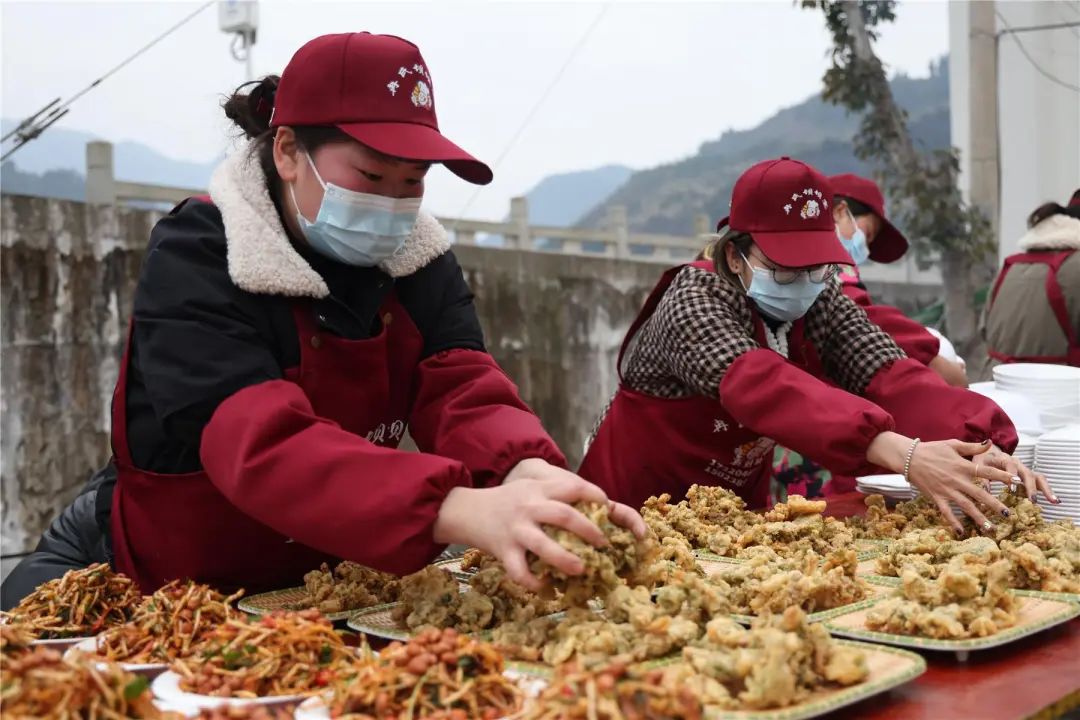 廚師們將豬腳、扣肉等菜肴端上餐桌