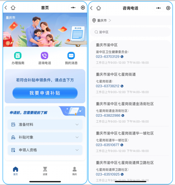 答:進入“育兒補貼申領”頁面,點擊上方的“咨詢電話”,輸入關鍵詞,可搜索您對應區縣/街道/社區的值班電話,有任何疑問,都可撥打咨詢。
