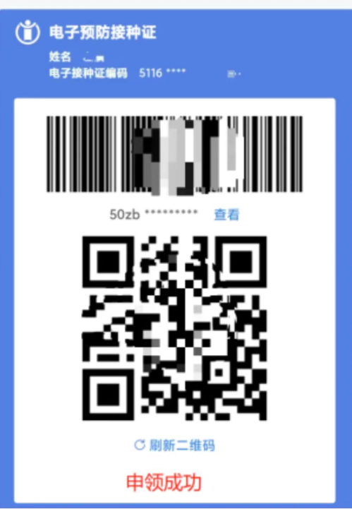 申領(lǐng)成功(提示申領(lǐng)成功后會(huì)顯示一個(gè)二維碼,該二維碼為動(dòng)態(tài)碼,可以在接種時(shí)的各環(huán)節(jié)使用)。