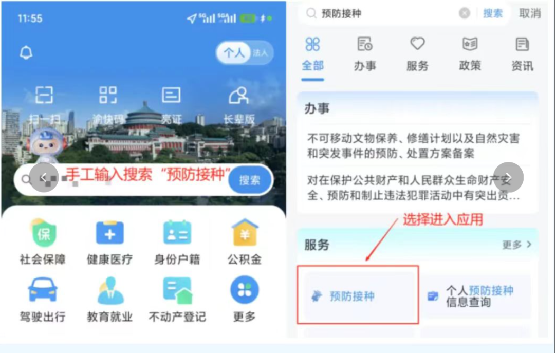 在“渝快辦”首頁(yè)搜索欄搜索“預(yù)防接種”,選擇服務(wù)“預(yù)防接種”打開(建議將“預(yù)防接種”添加到“我的常用”里面,方便后期使用)。