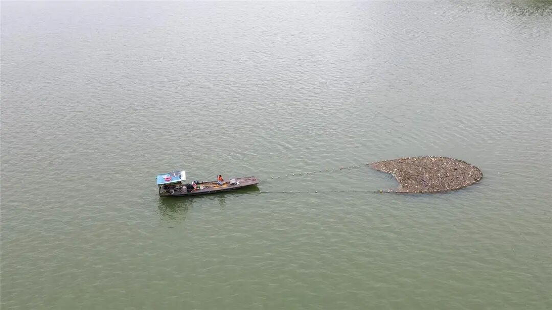 分工協作對江面漂浮物進行打撈清理